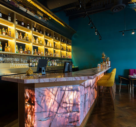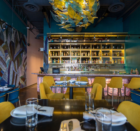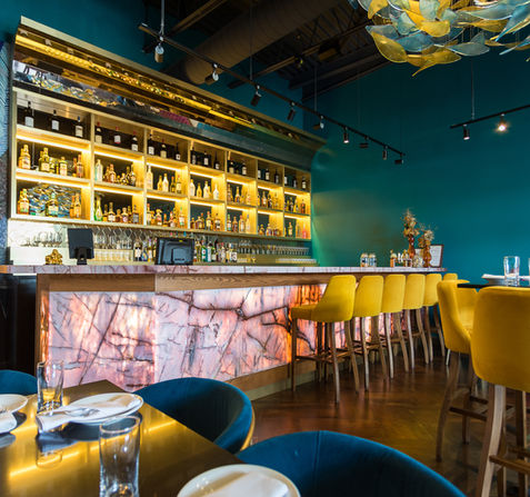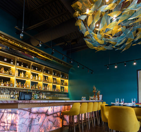 Elevate your experience in our stylish cocktail lounge, perfect for private events or a sophisticated evening out. The lounge features a backlit onyx full-service bar, luxurious textured wallpapers, and a stunning handmade light fixture from Italy. With vibrant and contemporary seating arrangements, our cocktail lounge comfortably accommodates up to 35 guests seated or 45 standing. Whether you're enjoying handcrafted cocktails or socializing with friends, our lounge offers an unparalleled setting for any occasion.